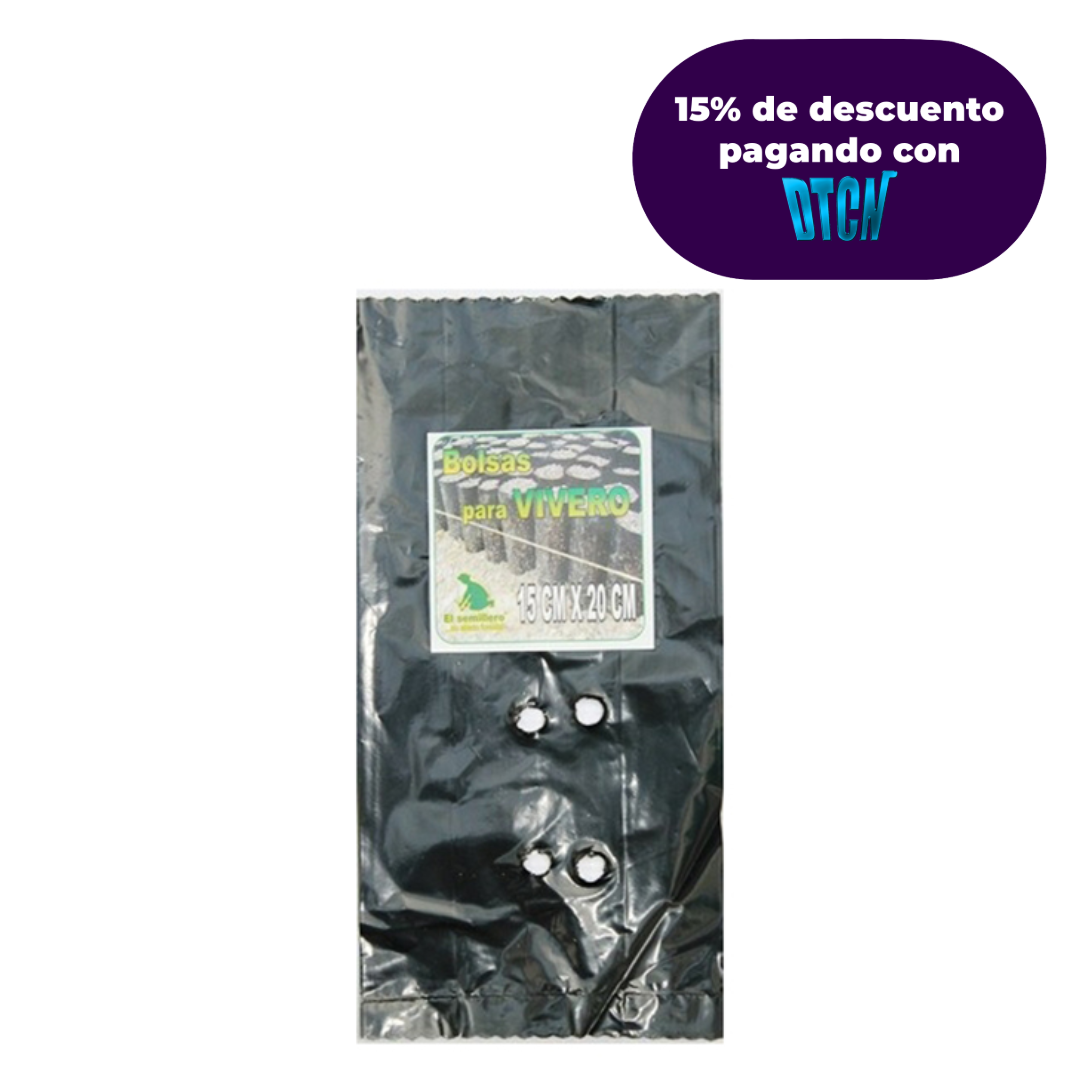 Bolsa para vivero ideal para fabricación de producción, hechas en Polipropileno de Baja densidad. 70% Original y 30% Recuperado, ideales para arboles que tengan una duración de 4 y 7 meses. Color negro; Dimensiones 15 x 20 cm.